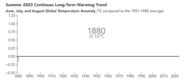 The map above depicts global temperature anomalies for June, July, and August 2023. It shows how much warmer or cooler Earth was compared to the baseline average from 1951 to 1980. Note that the deepest reds are at least 4°C (7°F) above the mean.