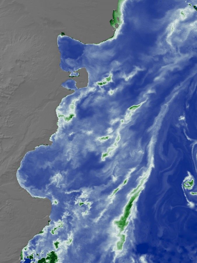 The aquamarine stripes and swirls are likely coccolithophores, a type of phytoplankton with microscopic calcite shells that can give water a chalky color. The various shades of green are probably a mix of diatoms, dinoflagellates, and other species. Previous ship-based studies of the region have shown that Emiliania huxleyi coccolithophores and Prorocentrum sp. dinoflagellates tend to dominate. Scientists are working to identify types of phytoplankton from satellite images; hyperspectral imagers planned for future satellite missions should make that easier.