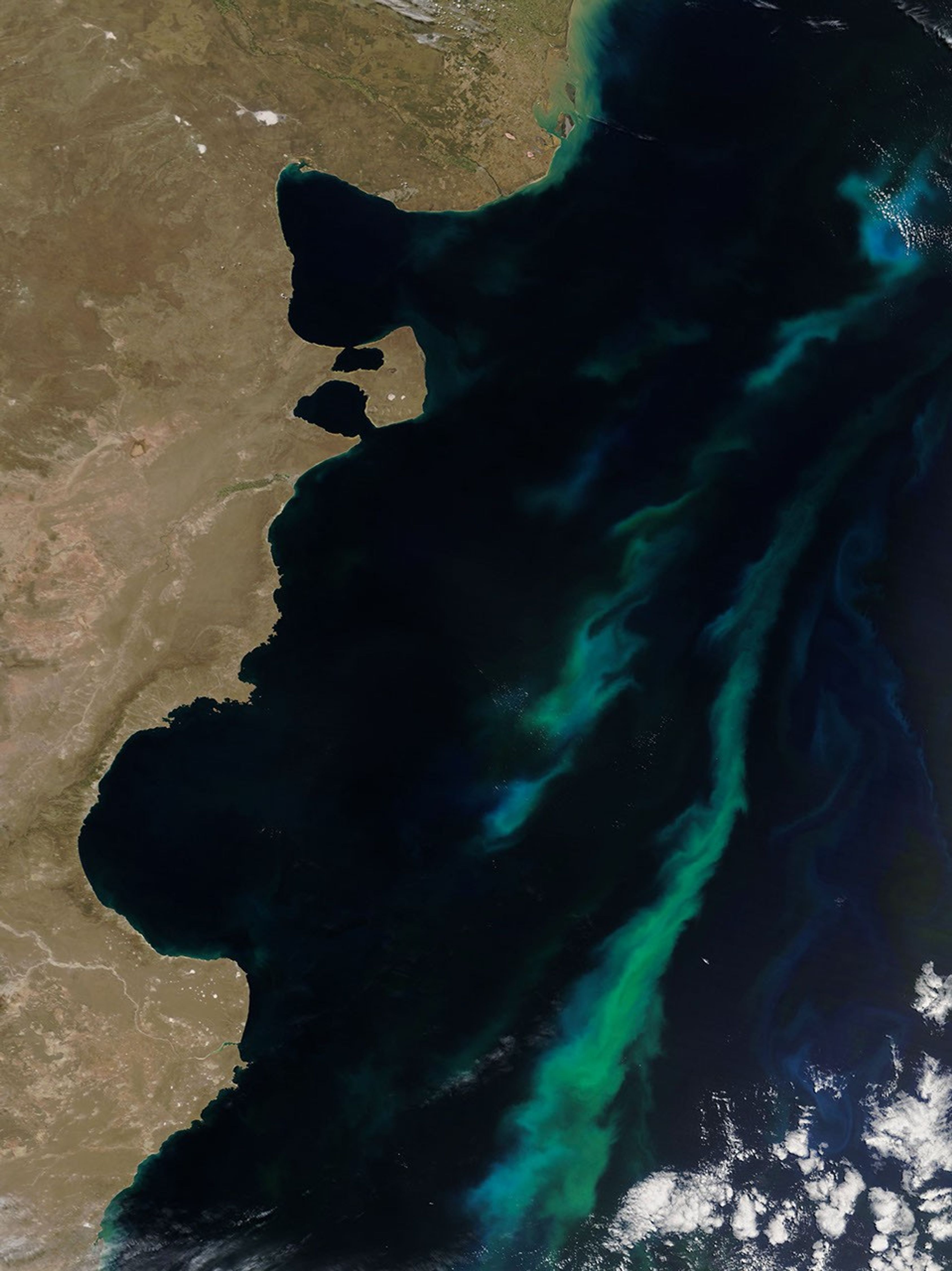 Spring and summer are bloom times for plants on land; they are also bloom times for plant-like organisms in the ocean. Fueled by the abundant sunshine of midsummer, phytoplankton were recently spied blooming off the coast of Argentina.
