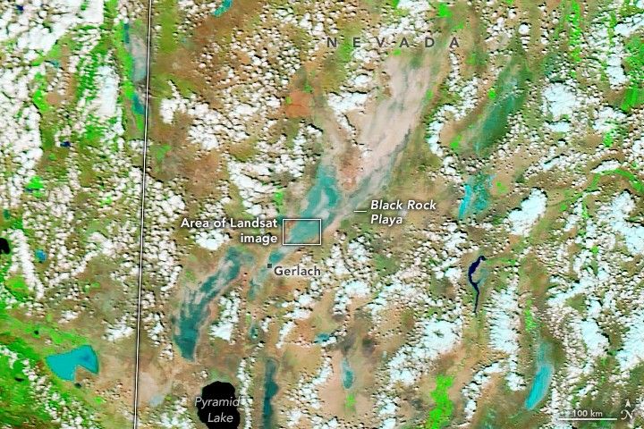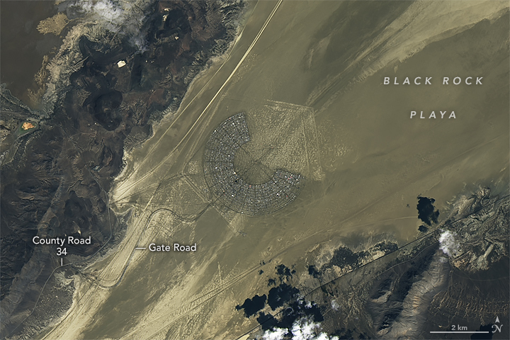 Since 1990, festivalgoers have constructed a temporary settlement in the Black Rock Desert in late August and early September for the Burning Man gathering. The 2023 version of the camp is visible in the Landsat image above. It is situated in the middle of the Black Rock Playa, a flat, featureless expanse stretching northeast from the town of Gerlach for more than 30 miles (50 kilometers). The playa is a remnant of a large prehistoric lake, Lake Lahontan, which filled in a large portion of the Great Basin over 15,000 years ago.
