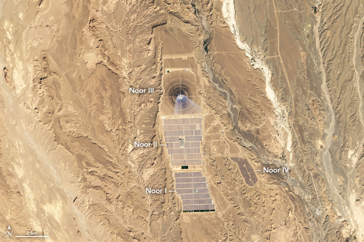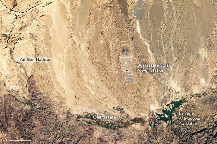 For centuries, caravan traders used villages in the Ouarzazate basin in Morocco as a stopover on journeys between North Africa and Europe. In recent decades, the entertainment industry discovered the small sedimentary basin flanking the High Atlas and Anti-Atlas mountains and the area has become a center of movie and television production. Most recently, the renewable energy sector has capitalized on the region’s dry, sunny weather by building a large concentrated solar-thermal power plant.