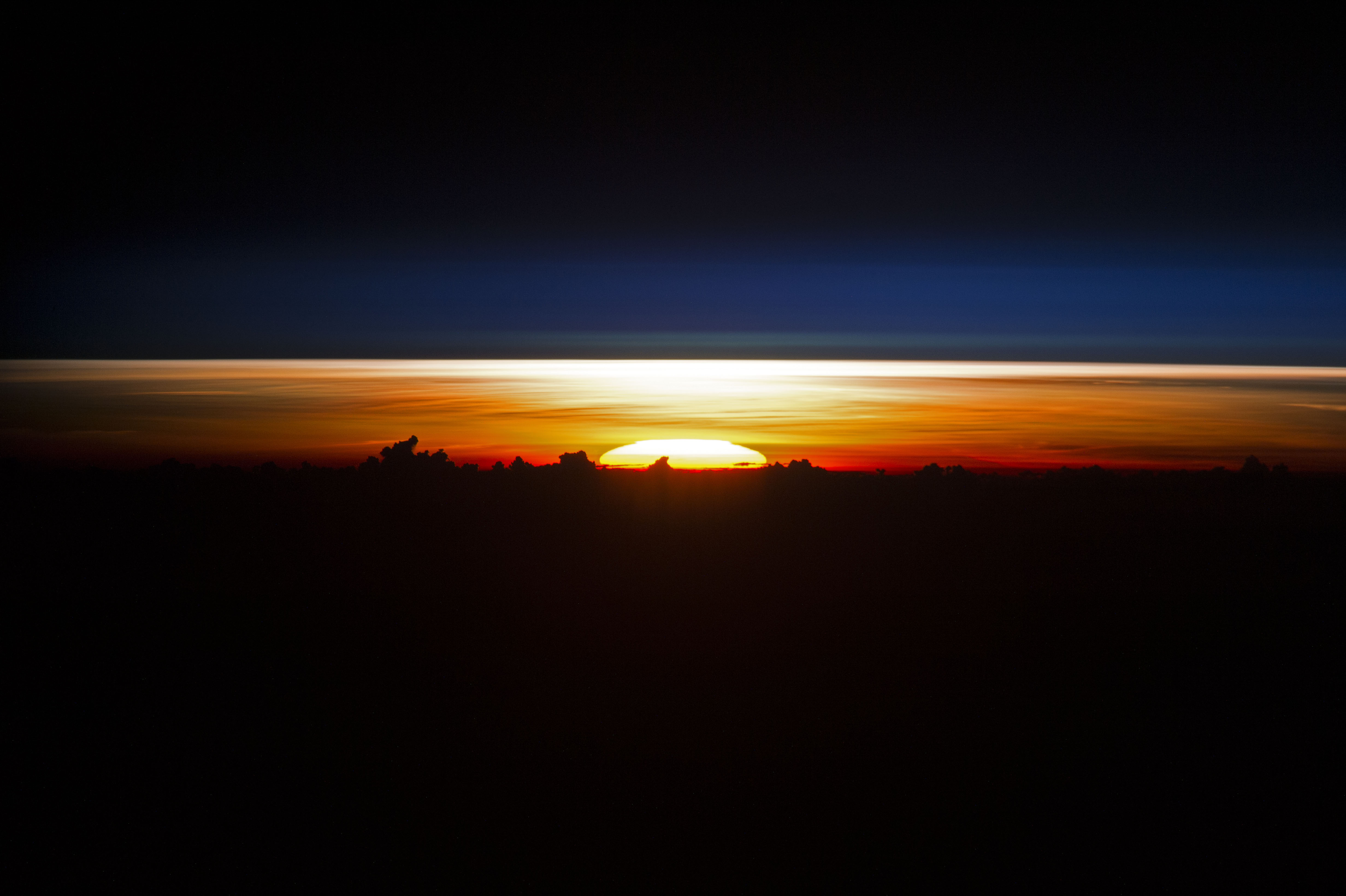 An astronaut aboard the International Space Station (ISS) took this photograph of the partial disc of the Sun just as it began to rise, creating a sheet of light across the horizon. Silhouetted clouds give the sense of a jumbled mountain range. Numerous individual layers of the atmosphere appear above the Sun from this perspective.