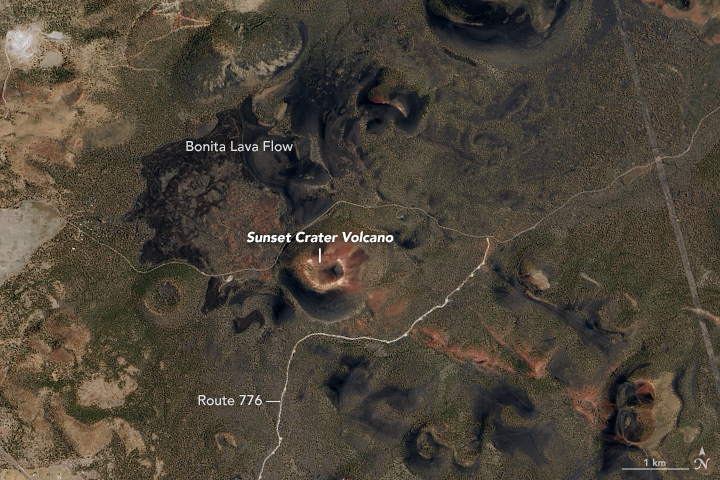On July 12, 2016, the Operational Land Imager (OLI) on the Landsat 8 satellite captured a natural-color image (above) of the crater and the surrounding San Francisco Volcanic Field. The image was draped over terrain data from the Advanced Spaceborne Thermal Emission and Reflection Radiometer (ASTER). Note: the scene was rotated to create this image, so north is to the right. The closeup below shows Sunset Crater as observed by OLI, but without the terrain drape (north is up). To the east of the cone, a field of dark, hardened rock from the Bonita Lava Flow is still visible.