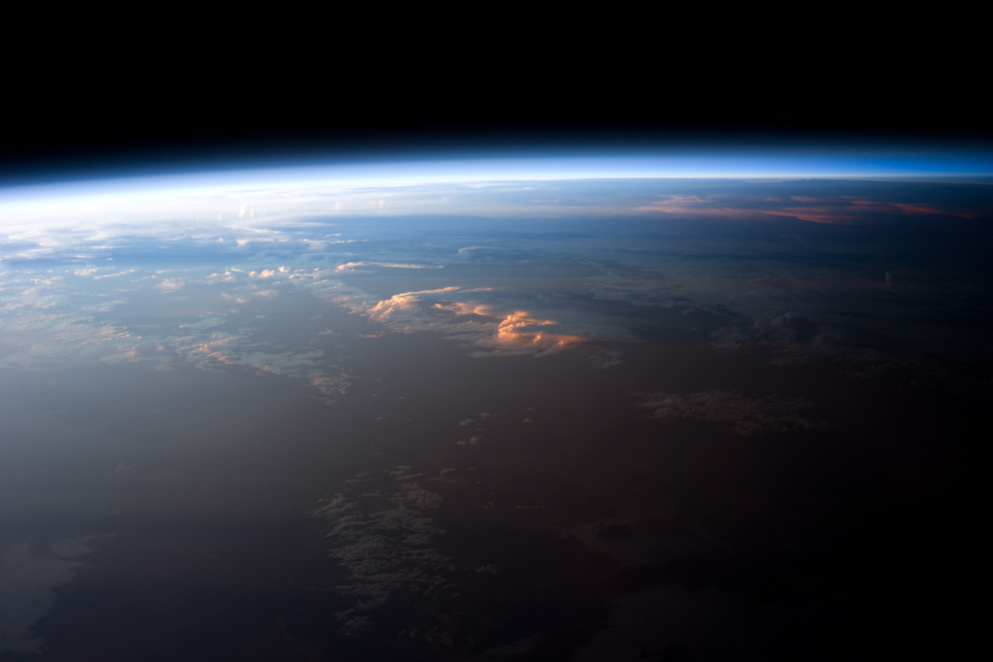The terminator is visible in this panoramic view across central South America, looking towards the northeast. An astronaut shot the photo at approximately 7:37 p.m. local time. Layers of the Earth’s atmosphere, colored bright white to deep blue, are visible on the horizon (or limb). The highest cloud tops have a reddish glow due to direct light from the setting Sun, while lower clouds are in twilight.
