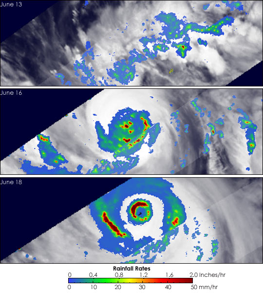 The Tropical Rainfall Measuring Mission (TRMM) satellite monitored Dianmuâs progress as it strengthened in the West Pacific. The top image was taken at 11:48 UTC on June 13, 2004. The image shows the horizontal distribution of rain intensity. Rain rates in the center swath are from the TRMM Precipitation Radar (PR), while rain rates in the outer swath are from the TRMM Microwave Imager (TMI). The rain rates are overlaid on infrared (IR) data from the TRMM Visible Infrared Scanner (VIRS). At the time of the first image, Dianmu was still a tropical depression with winds estimated at just 30 knots (35 mph) by the Joint Typhoon Warning Center. TRMM shows a rather disorganized area of moderate (green) to light (blue areas) intensity rain with only weak evidence of a center. The center image was taken at 10:40 UTC on the 16th when Dianmu was a super typhoon. The PR did not pass over the center, but the IR data (white area) does show a very symmetrical cloud shield. The TMI captures some of the rainbands south of the center which have embedded areas of intense rainfall (dark red areas). The bottom image was taken at10:26 UTC on the 18th when Diamu was classified as a Category 4 storm with sustained winds of 130 knots (150 mph). TRMM reveals that Dianmu has what is termed a âdouble eyewallâ structure that can occur in the most powerful tropical cyclones. It is apparent by the two concentric rings in the rain field. The northwestern half of the inner eyewall is made up of very intense rainrates (dark red areas) with intense rainrates also visible in the western portion of the outer eyewall. Eventually the outer eyewall will contract and replace the inner one.
