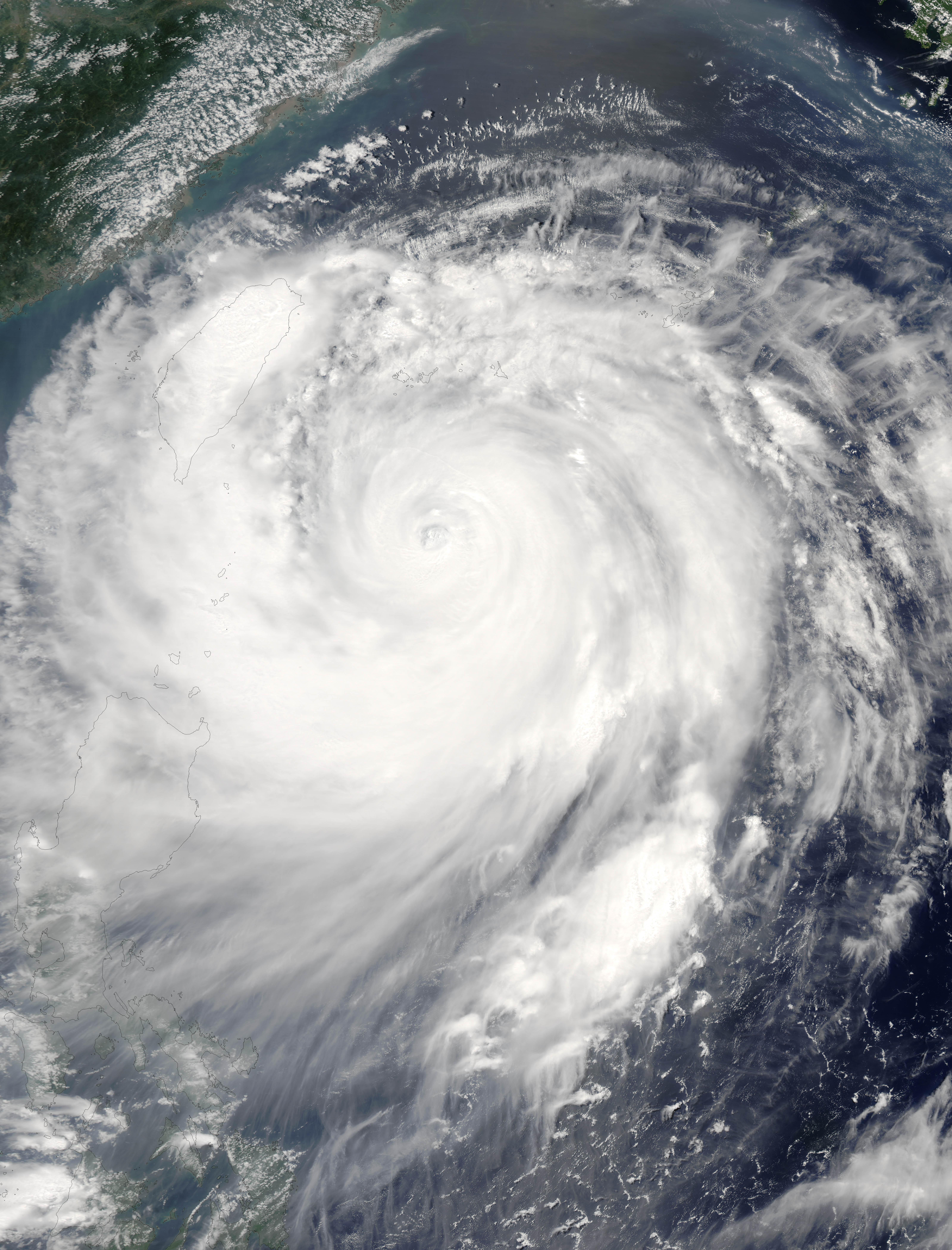 Super Typhoon Haitang is shown here bearing down on Taiwan on the afternoon of July 17, 2005. This image was captured by the Moderate Resolution Imaging Spectroradiometer (MODIS) on the Aqua satellite at 04:40 UTC (12:40 p.m. Taipei time). At this time, the typhoon had built into a Category 4 storm on the Saffir-Simpson scale, sufficient for it to be dubbed a super typhoon. Sustained winds were around 230 kilometers per hour (125 knots) with peak gusts as high as 280 km/hr (150 knots).