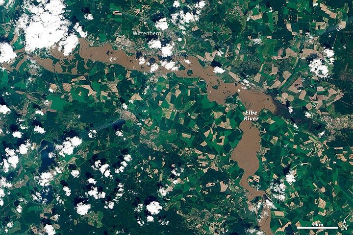 On June 7, 2013, the Operational Land Imager on Landsat 8 captured a natural-color image (top) of flooding near Wittenberg, in the German state of Saxony-Anhalt. For comparison, the lower image shows the same area on May 6. Note how the green floodplain around the river in the May image is completely inundated with muddy water in the June image. Puffs of white cumulus clouds are sprinkled across each image.