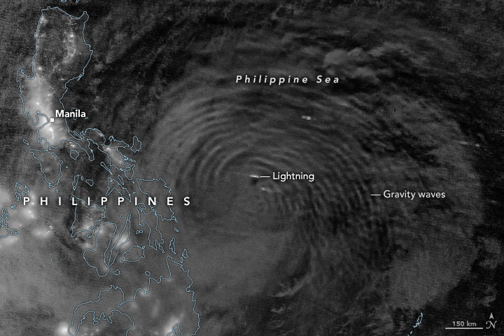 This image was acquired in the early morning hours of April 18 with the VIIRS day-night band (DNB) on the NOAA-NASA Suomi NPP satellite. The DNB detects light in a range of wavelengths from green to near-infrared and uses filtering techniques to observe light signals such as city lights, fires, and reflected moonlight. The image shows atmospheric gravity waves propagating away from the eye of the storm.