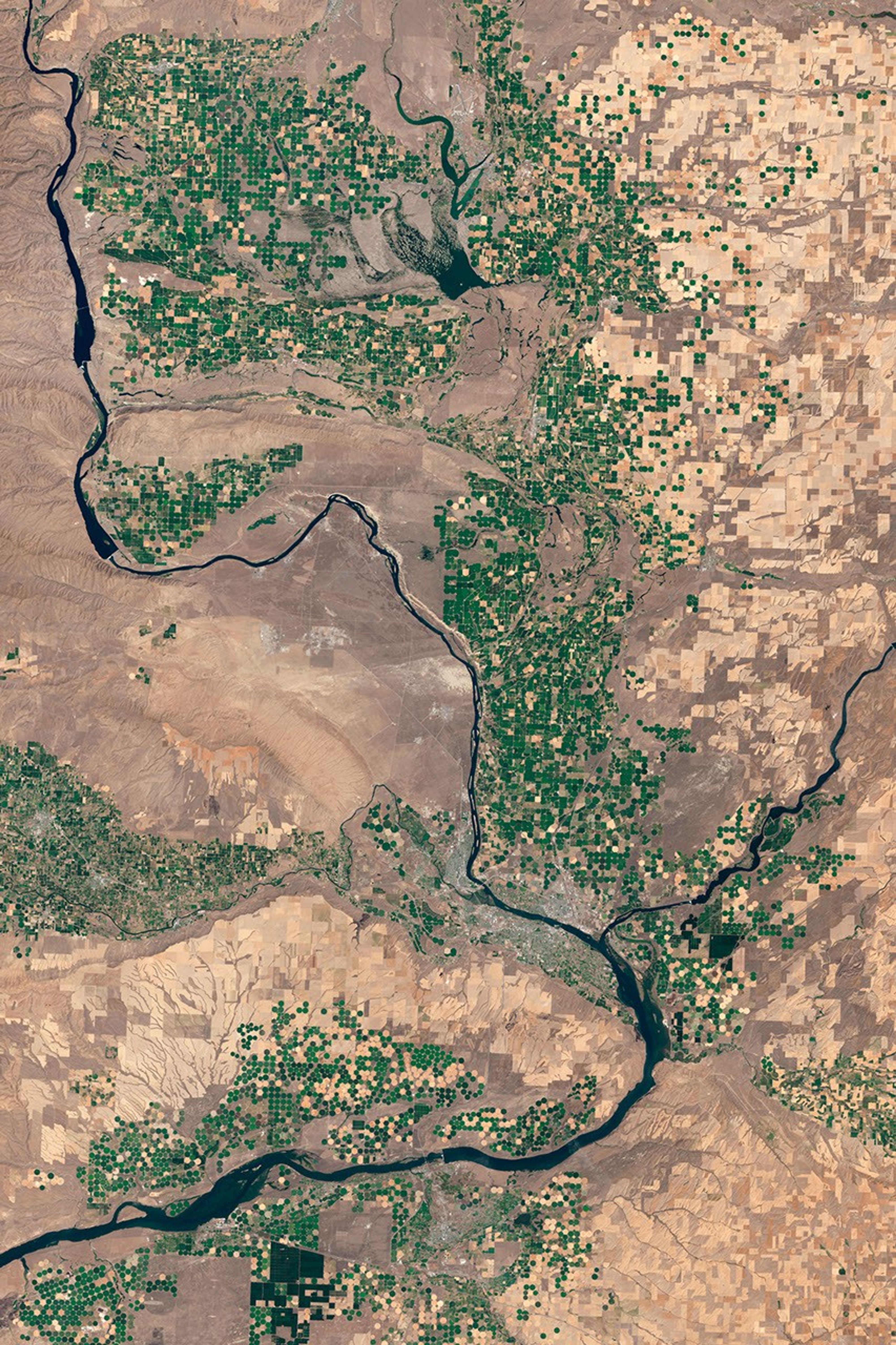 The lower image provides a landscape scale view of farming. The Landsat 7 satellite acquired the natural-color image on July 31, 2002. Bright green and gold fields stand out in stark contrast to the arid landscape along the Columbia River in western Washington. At this scale it is possible to gauge how healthy a crop is and estimate how much food it might produce. The United States Department of Agriculture uses such satellite data extensively to help determine where, when, and which crops are planted each year. They also use it to predict yields and to make commodity forecasts.