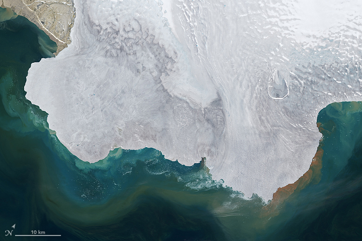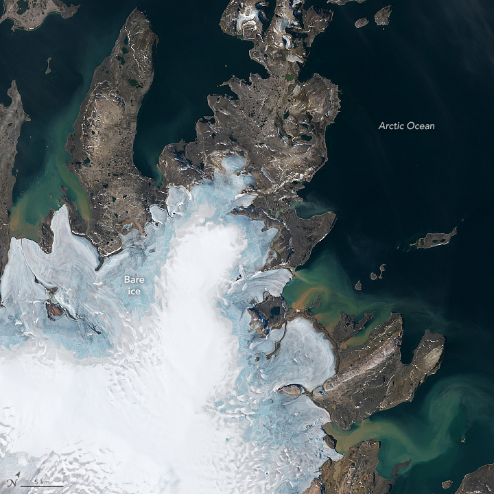The OLI (Operational Land Imager) on Landsat 8 captured these images of Nordaustlandet—the second largest island in the archipelago—on August 9 as water and sediment drained off the coast and into the Arctic Ocean. Sediment is likely causing the striking swirls of color in the water surrounding the island. The melting of seasonal snow and an older, compressed layer of snow called “firn,” left some areas of glacial ice (light blue) bare and exposed in the images.