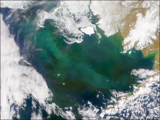 During a recent pass (May 13, 2001) over the Bering Sea, theSea-viewing Wide Field-of-view Sensor (SeaWiFS) captured this true-colorperspective of the region. The image shows a portion of the Bering Seafrom the west coast of Alaska to the international dateline. Noticethat the water is brightened by a large phytoplankton bloom,phytoplankton remains, or other detritus suspended near the surface.The varying intensities and shades of color correspond to differentspecies and concentrations of phytoplankton.