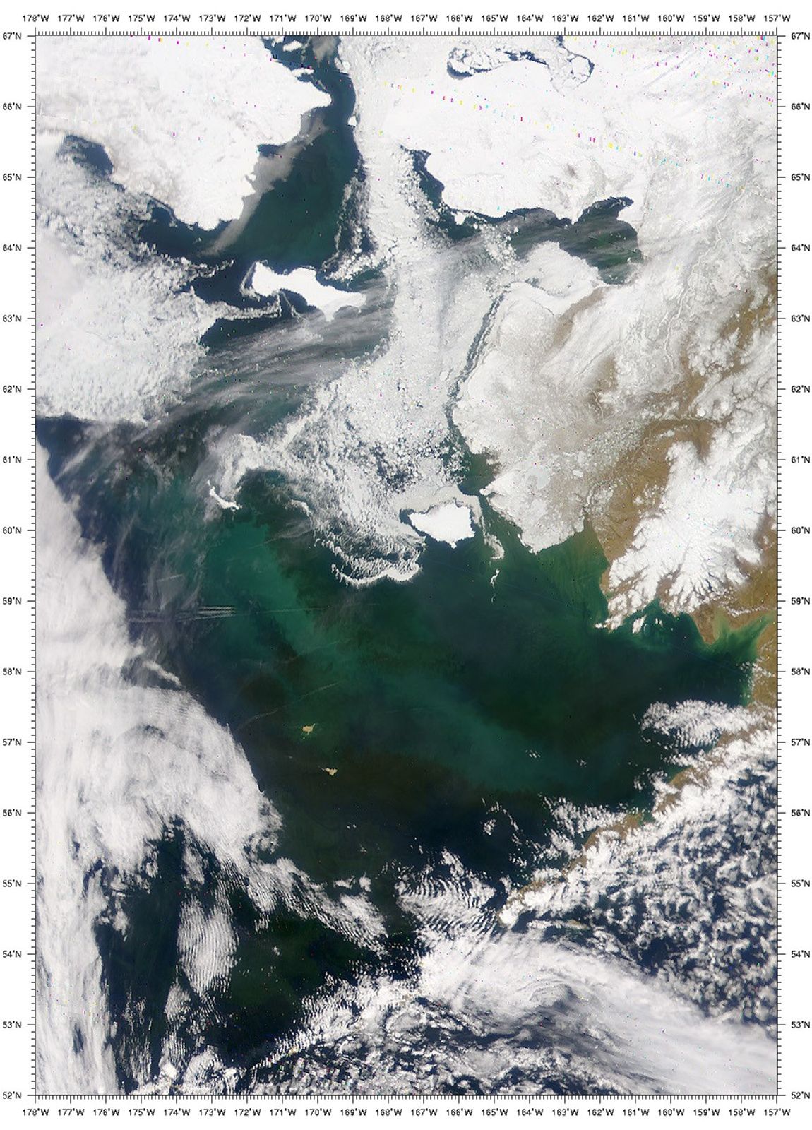During a recent pass (May 13, 2001) over the Bering Sea, theSea-viewing Wide Field-of-view Sensor (SeaWiFS) captured this true-colorperspective of the region. The image shows a portion of the Bering Seafrom the west coast of Alaska to the international dateline. Noticethat the water is brightened by a large phytoplankton bloom,phytoplankton remains, or other detritus suspended near the surface.The varying intensities and shades of color correspond to differentspecies and concentrations of phytoplankton.