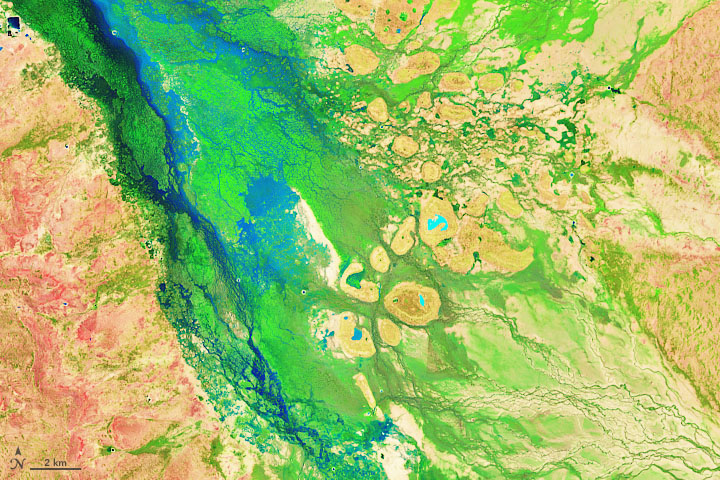 The images on this page show swollen rivers and wetlands near the town of Thargomindah, which recently experienced its wettest day in 21 years. The first image shows Lake Bindegolly National Park, located about 40 kilometers (25 miles) east of Thargomindah. The second image shows a stream just south of Lake Bindegolly. Both images were acquired on March 8, 2020, by the Operational Land Imager (OLI) on the Landsat 8 satellite.