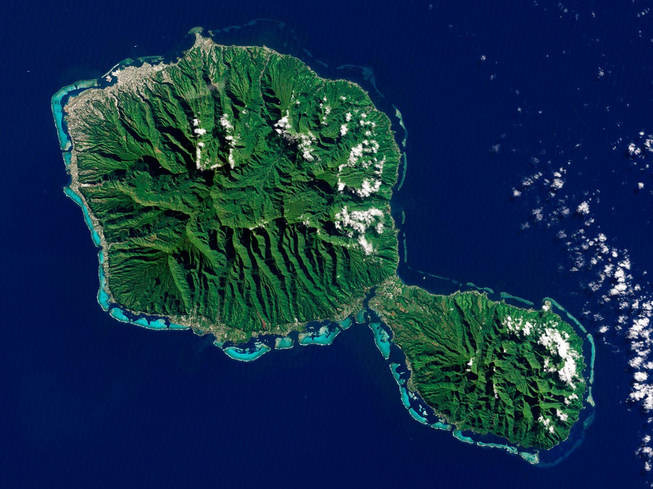 Yet something else besides volcanic activity has shaped Tahiti: rain. Heavy tropical rains have carved deep valleys, some with nearly vertical walls up to 1,000 meters (3,000 feet) tall. The angled sunlight in this image brightens some slopes, while leaving others in shadow. Tahiti’s sharp relief has complicated the geological surveys because they cause so much erosion. But the same rains have also promoted the growth of the lush plants that carpet both Tahiti-Nui and Tahiti-Iti.