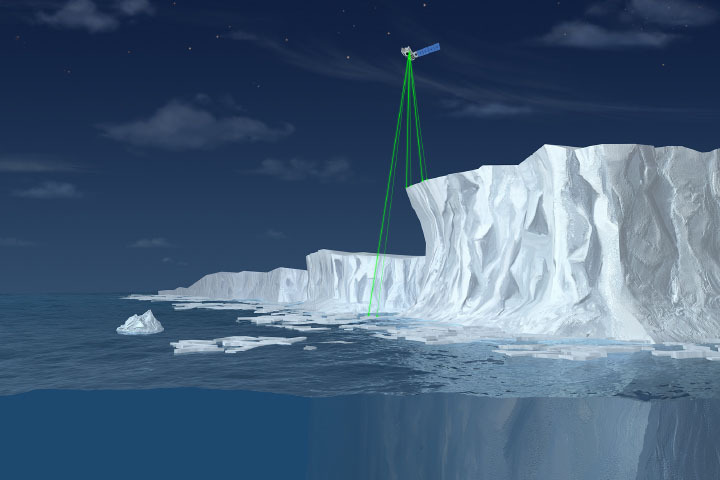 Scientists can use radar and laser altimeters to measure changes to ice elevation. These remote sensing instruments operate by sending radio or laser light pulses toward Earth’s surface and recording the reflections as they bounce back. By measuring the time between the outgoing and returning signal, and knowing the precise altitude of the satellite above ground, scientists can calculate the elevation of the ice surface. Then by comparing multiple altimeter passes over months and years, they can derive surface changes over time.