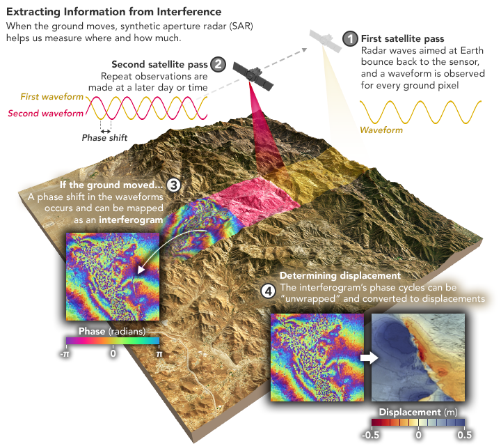 By comparing SAR data collected of the same location at two different times—a technique called interferometry (InSAR)—scientists can see how the surface changed. While InSAR observations of vertical land movements are not quite as detailed as those from GNSS, InSAR can make consistent observations over much larger areas. For instance, a recent study of land subsidence along the California coast drew data from a few hundred GNSS sites, while satellite InSAR observations include hundreds of thousands of data points.