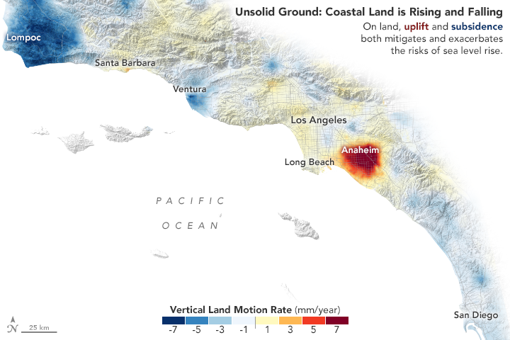 Groundwater extraction and oil production, in particular, can produce rates of subsidence approaching centimeters per year, compared to the millimeters per year typical of natural processes. For instance, the map of southern California below shows a zone of strong uplift around Santa Ana, a valley just south of Los Angeles, where groundwater management systems have replenished underground aquifers in recent years. Other parts of coastal California are subsiding mainly because of sediment compaction, oil extraction, and tectonics.
