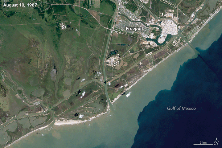 The image pairs on this page show two of the extreme cases. The beaches at Schiermonnikoog, The Netherlands (above), were among the fastest growing in the study, with growth of nearly 10 meters per year. The area just south of Freeport, Texas (below), is one of the largest erosive hotspots in the world, with beach being lost at a rate of nearly 15 meters per year along a 17-kilometer (11-mile) stretch. These natural-color images were acquired by the Thematic Mapper on Landsat 5 and the Operational Land Imager on Landsat 8.