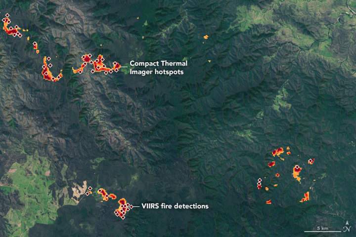 The images above highlight the difference. Both images show CTI’s view of large fires burning in the Gondwana Rainforests of New South Wales on November 1, 2019. The right image also includes the VIIRS fire detections (red diamonds) of the same area that day. The data were overlaid on a natural-color image acquired by the Operational Land Imager (OLI) on Landsat 8.