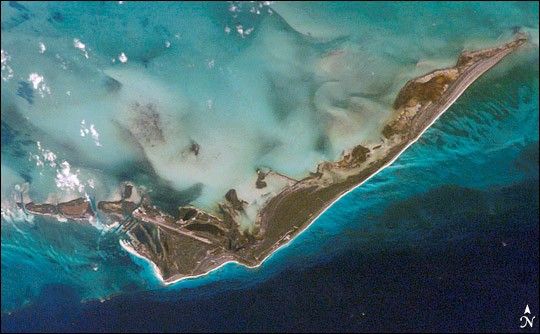 Two of Kiribati’s atolls, Tarawa and Maiana, appear in this image. Tarawa—remembered as the site of a brutal World War II battle—is the larger island. Each island consists of a ring of coral around a central lagoon. This photo shows calm conditions, with clear, still water in each central lagoon, and a light spray of clouds overhead.