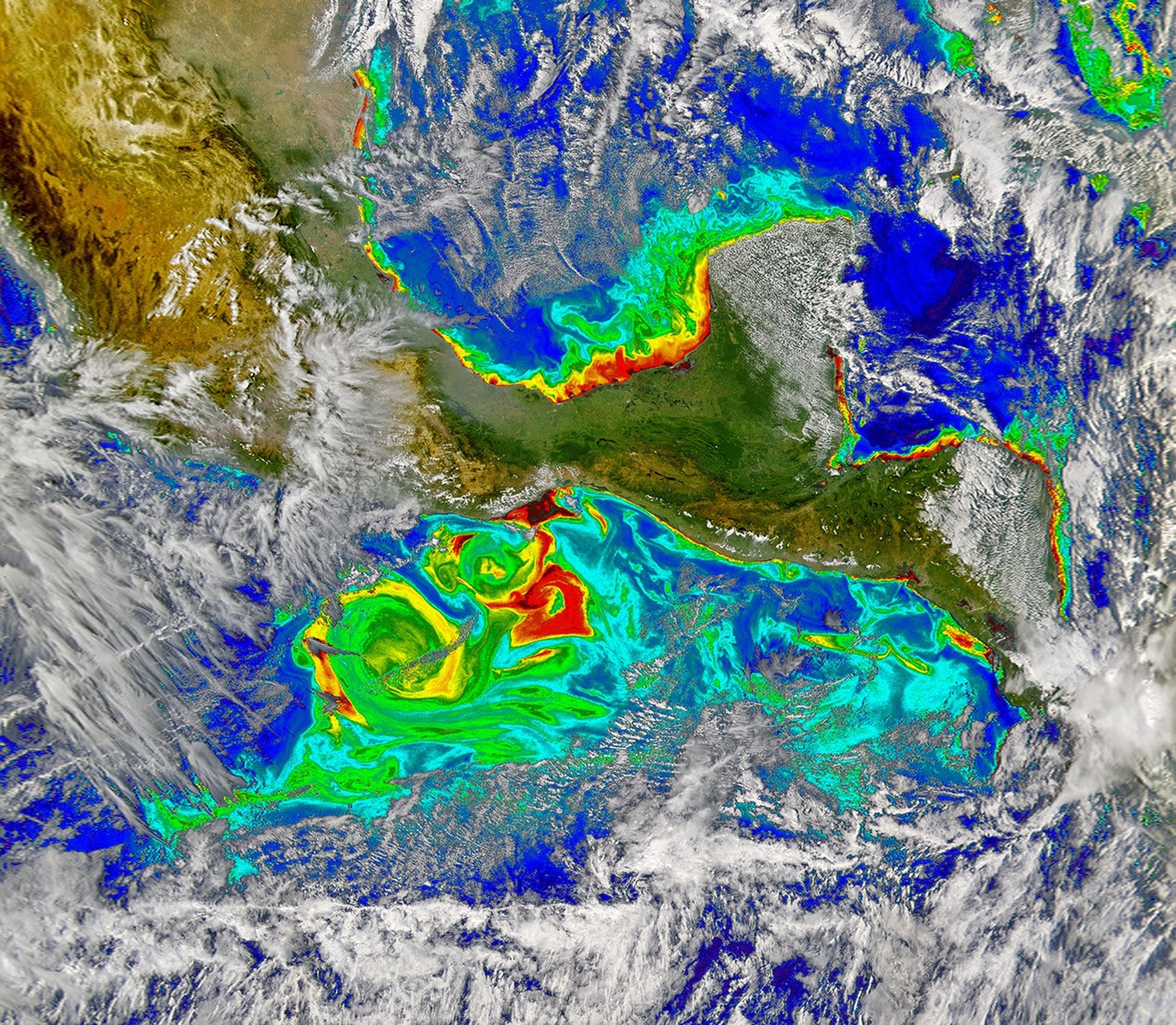This satellite image from the Sea-viewing Wide Field-of-View Sensor (SeaWiFS) shows the effect of the Tehuano winds on the ocean’s plant life on December 9, 2003. Winds blowing southwest from the Gulf of Mexico (top center) toward the Gulf of Tehuantepec (bottom left) churned up the water and initiated an algal bloom that is shown in the image in rainbow colors. The colors represent how much plant chlorophyll SeaWiFS detected in the surface water. Highest concentrations are dark red and lowest concentrations are blue.