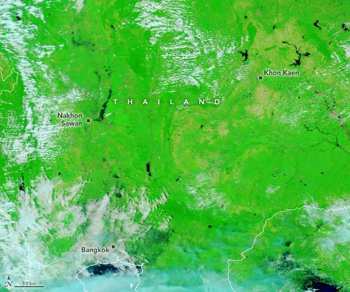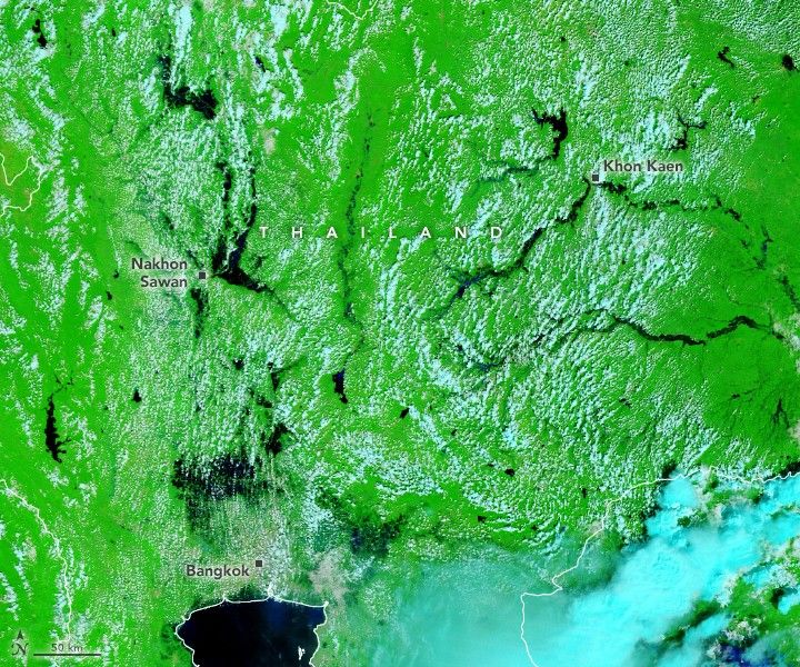 In these false-color images of the region north of Bangkok, water appears dark blue; saturated soil is light blue; vegetation is bright green; bare ground is tan; and clouds are white or turquoise. The images were acquired by the Moderate Resolution Imaging Spectroradiometer (MODIS) on NASA’s Terra satellite on October 20, 2021, and October 19, 2019.