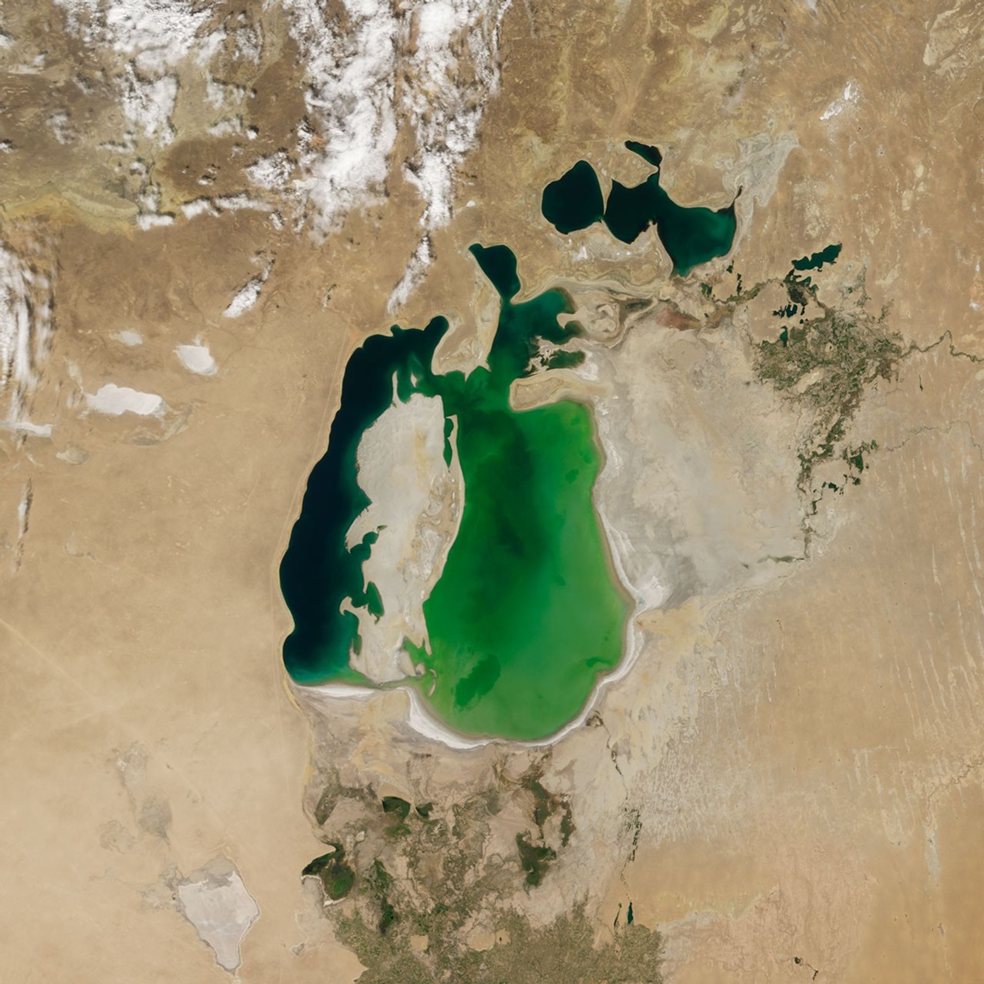 In the 1950s and 1960s, the government of the former Soviet Union diverted the Amu Darya and the Syr Darya—the region's two major rivers—to irrigate farmland. The diversion began the lake's gradual retreat. By the start of the Terra series in 2000, the lake had already separated into the North (Small) Aral Sea in Kazakhstan and the South (Large) Aral Sea in Uzbekistan. The South Aral had further split into western and eastern lobes.