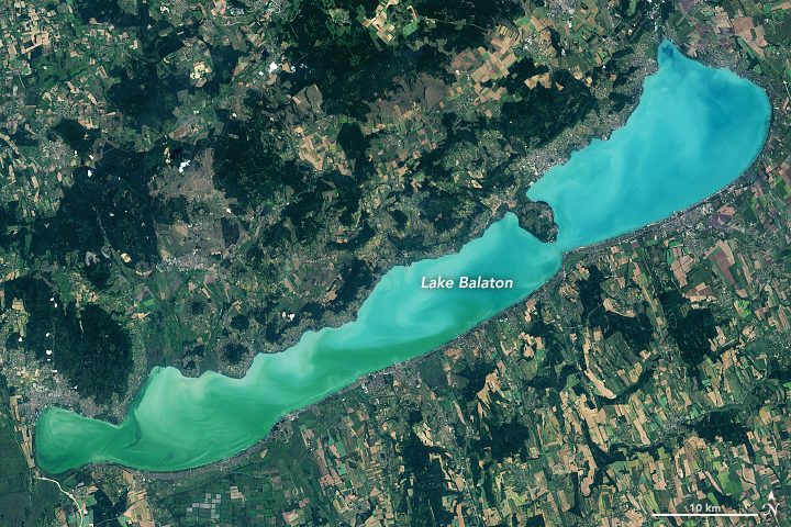Ho and colleagues found that lakes showing sustained improvement were rare—only six out of the 71 studied. Lake Balaton (pictured above) is one of those six. Sitting in southwest Hungary, Lake Balaton is the largest lake in Central Europe. It is a major tourist destination and key economic resource, so the local government has focused a lot of energy on a water management plan to reduce nutrient pollution. Those efforts could help explains the lake’s improvement across the study period. The natural-color image of Lake Balaton was acquired by Landsat OLI on August 31, 2019.