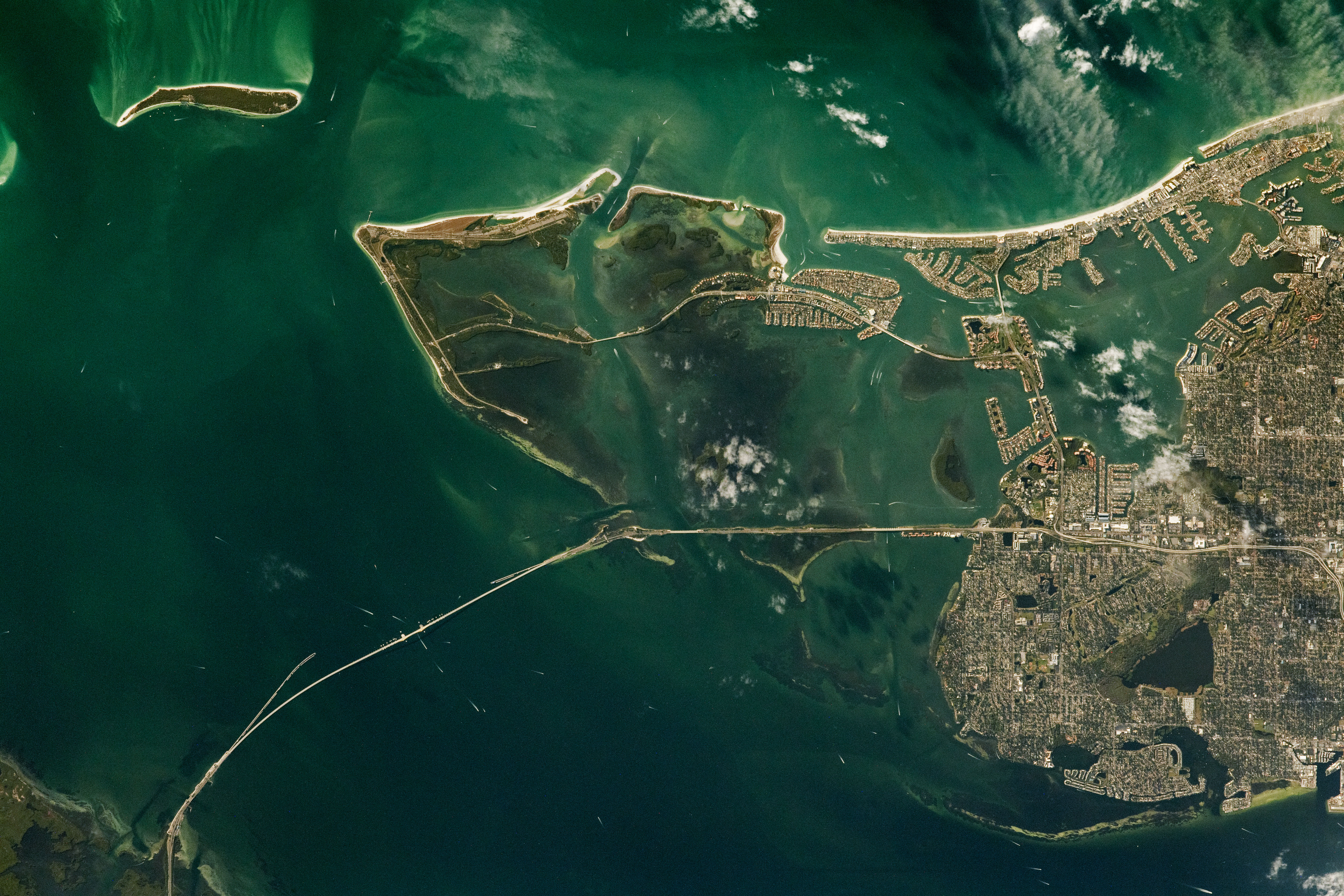 In this photograph taken by an astronaut on the International Space Station (ISS), white wakes mark the paths of ships passing under the Sunshine Skyway, a main thoroughfare between parts of Tampa Bay. Appearing as a large bite out of the western coastline, Tampa Bay is one of the defining features of the Florida coast when viewed from the ISS by day and by night. The different shades of color in and around the bay illustrate variations in water depth and the movement of suspended sediment.