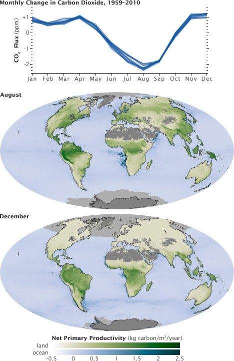 These maps show net primary productivity (the amount of carbon consumed by plants) on land (green) and in the oceans (blue) during August and December, 2010. In August, the green areas of North America, Europe, and Asia represent plants using carbon from the atmosphere to grow. In December, net primary productivity at high latitudes is negative, which outweighs the seasonal increase in vegetation in the southern hemisphere. As a result, the amount of carbon dioxide in the atmosphere increases.