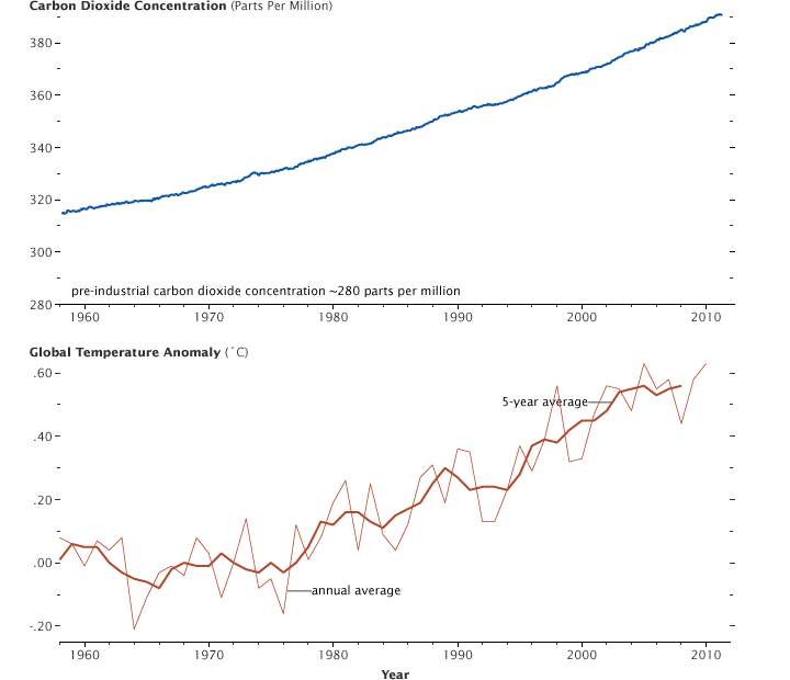 (Graph by Marit Jentoft-Nilsen and Robert Simmon, using data from the NOAA Earth System Research Laboratory. Maps by Robert Simmon and Reto Stöckli, using MODIS data.)