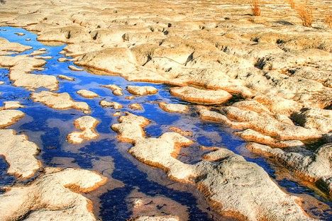 In the ocean, the calcium ions combine with bicarbonate ions to form calcium carbonate, the active ingredient in antacids and the chalky white substance that dries on your faucet if you live in an area with hard water. In the modern ocean, most of the calcium carbonate is made by shell-building (calcifying) organisms (such as corals) and plankton (like coccolithophores and foraminifera). After the organisms die, they sink to the seafloor. Over time, layers of shells and sediment are cemented together and turn to rock, storing the carbon in stone—limestone and its derivatives.