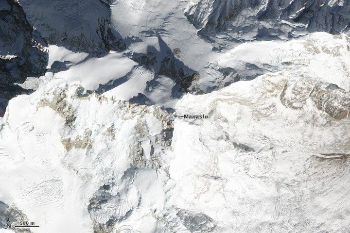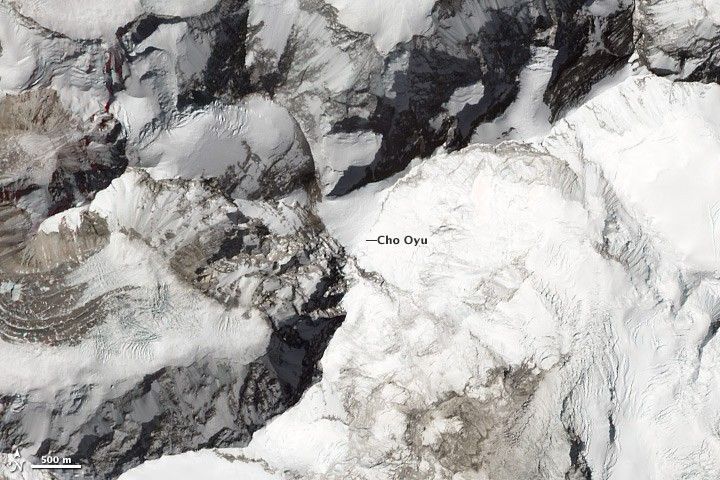 Though known today as one of easiest to climb, Shisha Pangma was the last eight-thousander summited due to restrictions on foreign travelers. A Chinese team reached the top in 1964, choosing a route that brought climbers up the northwest face along the northeast ridge. In the image above, much of the northwest face is cast in shadow. The steep, craggy south face—much more difficult to climb—rises more than 2,000 meters and has many areas with exposed rock.