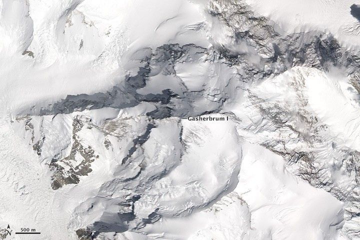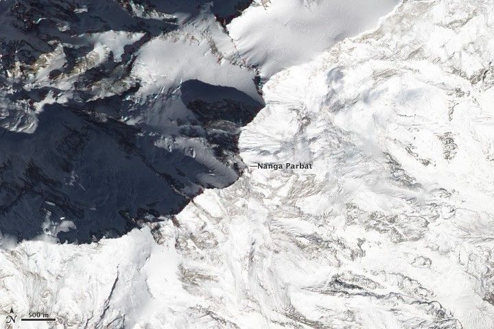 Meaning “naked mountain” in Urdu, Nanga Parbat is a reference to the generally snow-free south face. Known as the Rupal face, this is the world’s largest rock wall, rising some 4,700 meters (15,000 feet) from its base to the summit. The other faces—the Rakhiot face and the western Diamir—are also extreme. In the image above, the Rakhiot face is in shadow to the north, the Diamer face is to the east, and the Rupal face is to the south.