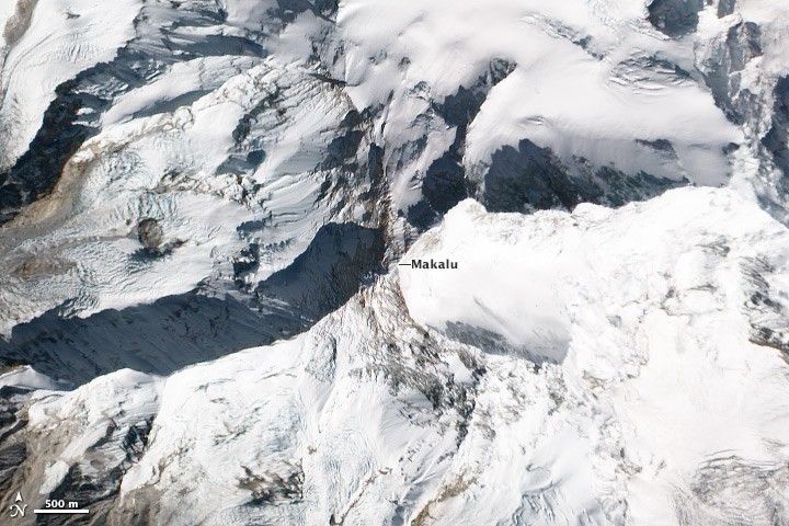 In Tibetan, Makalu means “Great Black”—a reference to the oft-exposed granite that makes up the mountain’s summit. The isolated peak is known for the strong winds that whip frequently around it and scour the snow away. The western and southern faces appear particularly bare in this image.