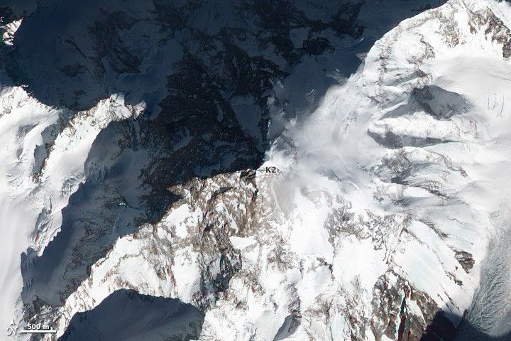 While the summit of an eight-thousander may represent the ultimate view on Earth, satellites take Messner’s concept of overview to a whole new level. The summit of Mount Everest is about 8.8 kilometers (5.5 miles) above sea level. Most polar-orbiting satellites fly at an altitude of 705 kilometers (438 miles). So when viewed from space, the world’s tallest mountains become blotches of shadow, rock, and snow. Epic glaciers become narrow tongues of ice feeding glacial lakes that look like puddles. Deadly storms become mere tufts of cloud.