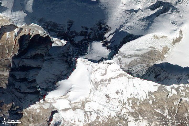On June 3, 1950, the French climbers Maurice Herzog and Louis Lachenal reached the summit of Annapurna, making it the first eight-thousand meter peak ever successfully climbed. Herzog and Lachenal first attempted the northwest face—they called it the cauliflower face (shown in shadow in the image above)—then switched over to the avalanche-prone north face when they realized the northwest face was too rugged for their porters. The extremely steep south face, a wall of rock that rises 3,000 meters (9,800 feet), is said to be one of the most difficult climbs in the world.