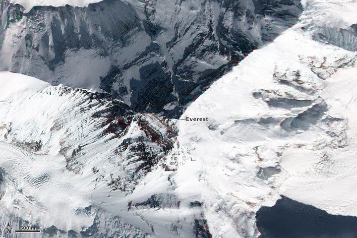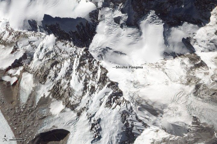 Though known today as one of easiest to climb, Shisha Pangma was the last eight-thousander summited due to restrictions on foreign travelers. A Chinese team reached the top in 1964, choosing a route that brought climbers up the northwest face along the northeast ridge. In the image above, much of the northwest face is cast in shadow. The steep, craggy south face—much more difficult to climb—rises more than 2,000 meters and has many areas with exposed rock.