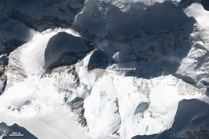 An Austrian team was the first to reach Gasherbrum II’s summit, following a route up the south face along the southwest ridge in 1956. The Austrian team pioneered a new approach to climbing. During the ascent, night overtook the climbers at about 7,500 meters (24,600 feet). Rather than turning back to camp, they spent the night huddled near a cliff with no gear other than what they were carrying—a technique known as bivouacking. It was the first time a team deliberately bivouacked the night before attempting to summit an eight-thousander.