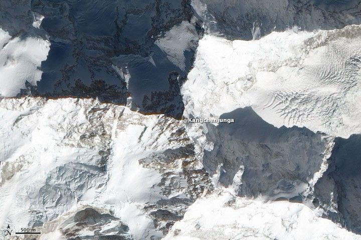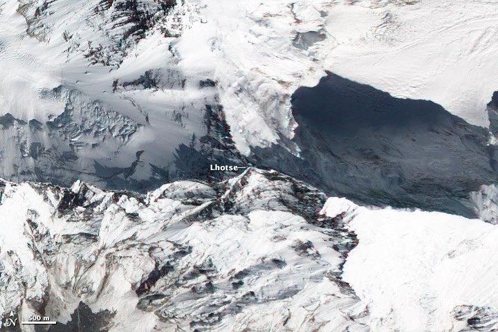 In Tibetan, Makalu means “Great Black”—a reference to the oft-exposed granite that makes up the mountain’s summit. The isolated peak is known for the strong winds that whip frequently around it and scour the snow away. The western and southern faces appear particularly bare in this image.