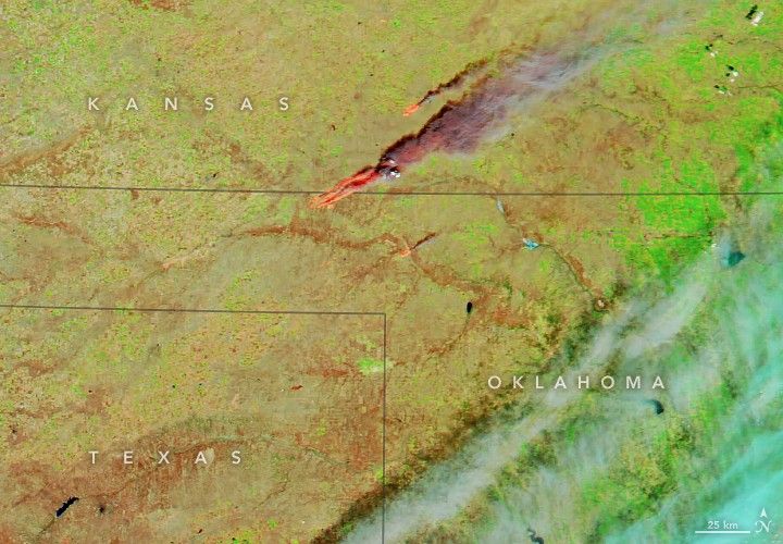 The prairie was already primed to burn. Several months earlier, abundant rain had fueled unusually lush growth. By March, near-record heat and several months of drought had turned that growth into flammable, dead grass. On March 6, a cold front brought 50-mile (80-kilometer) per hour winds roaring across the landscape. As these winds fanned the lightning-induced flames, the Northwest Oklahoma Complex charred nearly 3,000 square kilometers, an area nearly the size of Rhode Island.