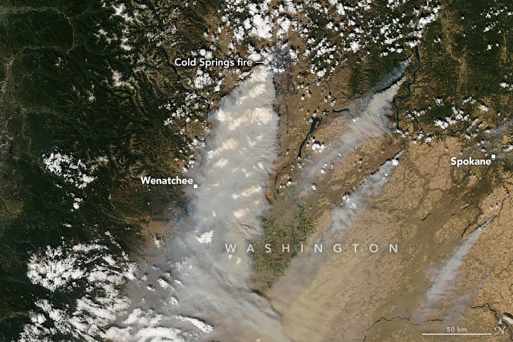 On September 8, winds strengthened as they spread across the plateau, streamed past the Cascades, and fanned several megafires at lower elevations in Oregon, including the Riverside, Beachie Creek, Lionshead, and Holiday Farm fires. The visualization ends focused on the Holiday Farm fire (second 50), a blaze that devastated the town of Blue River and destroyed more than 500 homes and offices. Together the Labor Day fires produced stunning amounts of smoke (below) that engulfed much of Washington, Oregon, and California for more than a week.