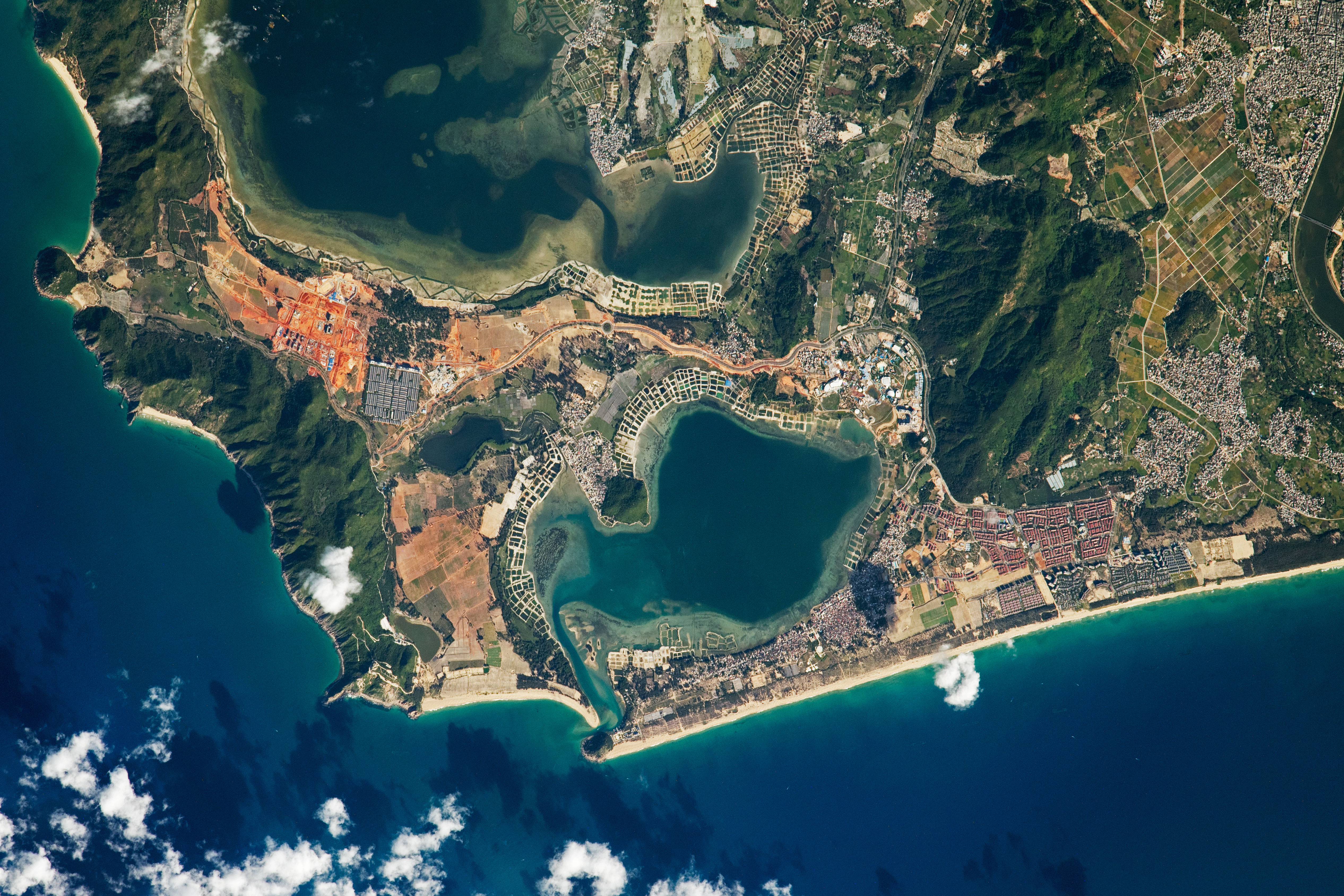 Situated in the South China Sea, the large island of Hainan is China’s southernmost province, spanning approximately 339,000 hectares (1,300 square miles). This photograph, taken by an astronaut onboard the International Space Station (ISS), focuses on the landscape around Gangmen Harbor and captures many typical characteristics of Hainan: forested mountain terrain juxtaposed with dense populations. Cleared lands show up with bright orange and red soils that owe their color to the oxidation of iron-rich sediments. The coasts are lined with tropical beaches, while the inner bays are lined with floating fishing villages often built in a grid-like patterns in shallow waters.