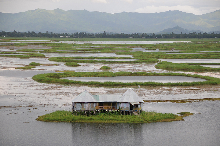 Loktak Lake is not only the largest freshwater lake in northeast India, it is also home to unique floating islands called “phumdis.“ These circular landmasses are made of vegetation, soil, and organic matter (at different stages of decomposition) that have been thickened into a solid form. The islands have a spongy surface that feels like a trampoline. Like an iceberg, most of the mass of phumdis lies below the water surface. During the dry season, when water levels drop, the living roots of the islands can reach the lakebed and absorb nutrients.