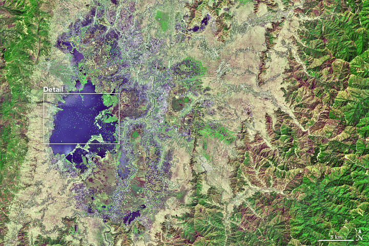 The top satellite images of Loktak Lake were acquired on March 19, 2018, by the Advanced Spaceborne Thermal Emission and Reflection Radiometer (ASTER) on the Terra satellite.