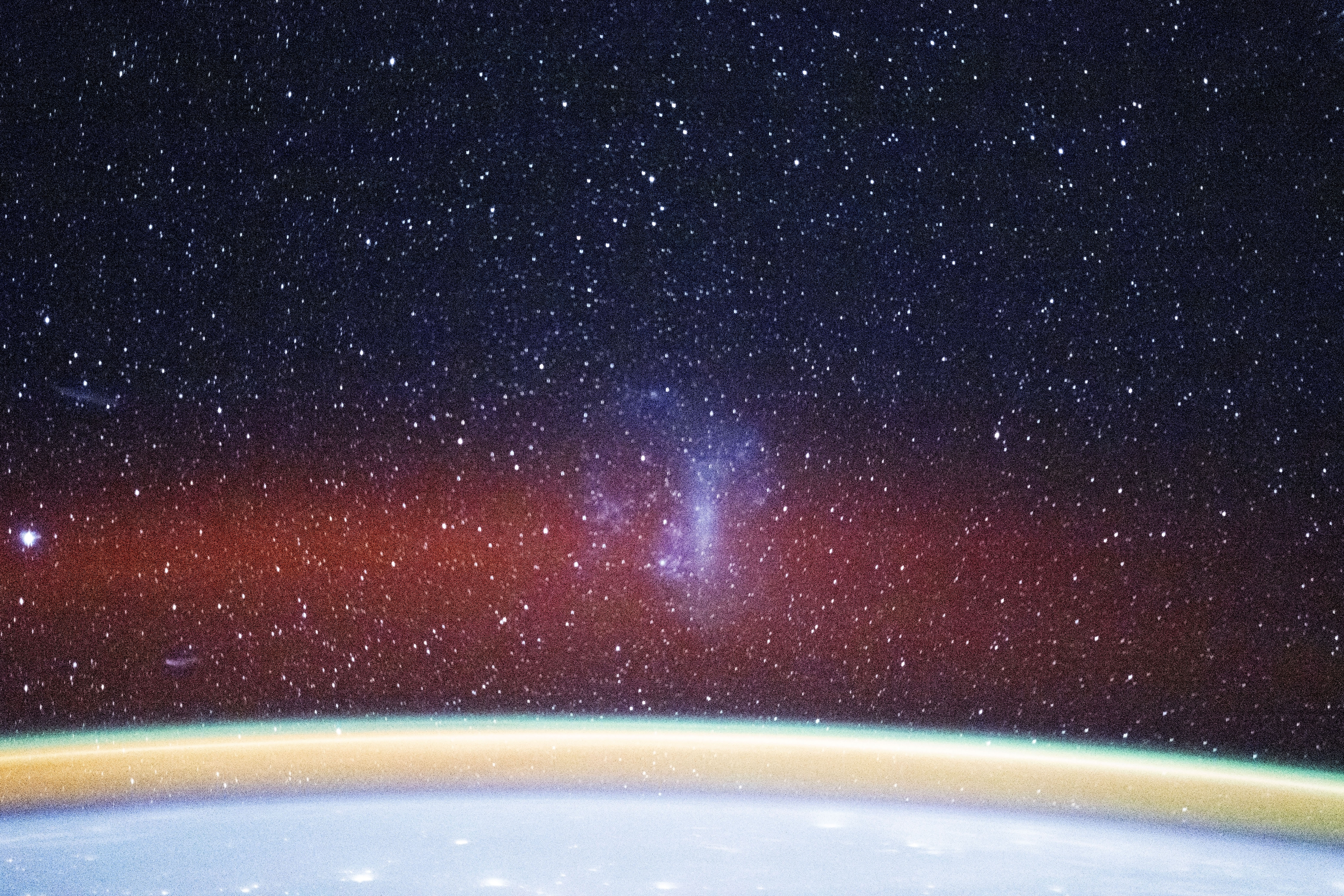 Located about 160,000 light-years away, the Large Magellanic Cloud (LMC) is an irregular dwarf galaxy consisting of billions of stars. It appears as a bright smudge in this photo, which was taken by an astronaut aboard the station on November 28, 2025. Arcing across the bottom of the image is Earth’s limb, along with yellow, green, and diffuse red layers of airglow.