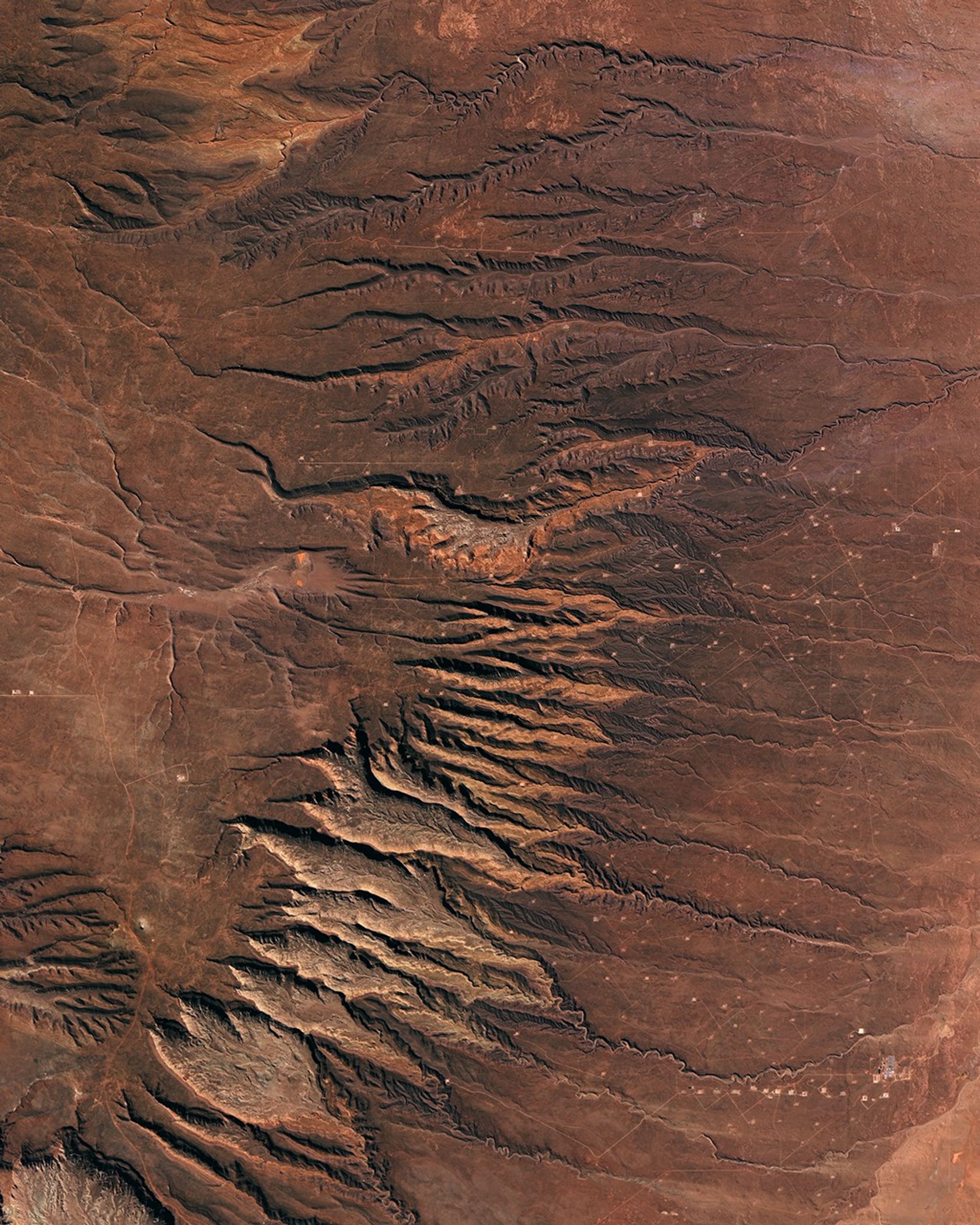 From space, boundaries between some of the major groups of sedimentary rock formations are visible. In the first image, the deep reds of the Candeleros Formation—a sequence of sandstones formed roughly 90 to 100 million years ago in a braided river system—dominate the landscape. These rocks are flanked in some areas, especially near the river, by a green-yellow sequence of rocks that are part of the younger Hunical Formation, formed during drier times. The older Royosa Formation, meanwhile, peeks through in some areas where erosion has scraped away overlying rock layers. (See the second image.)