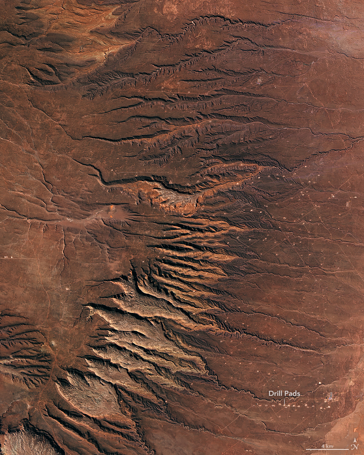 Petroleum geologists are more interested in what lies beneath the Candeleros Formation. Several layers of rock, formed when the area was covered by an ocean, contain gas and oil. While drilling has been ongoing here since 1918, the recent discovery of a large deposit of shale gas and oil in the Vaca Muerta Formation has made the Neuquén Basin one of the few regions outside of the United States where companies are pursuing horizontal drilling and hydraulic fracturing.