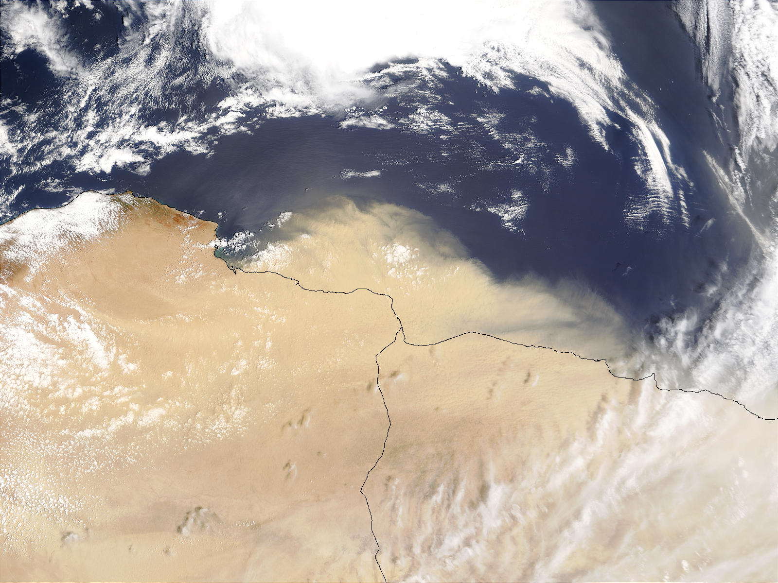 A dust storm is spilling sand out over the Mediterranean Sea off the coast of Libya (left) and Egypt (right) on May 28, 2003. This region of desert at the bottom of the image is called the “Great Sand Sea. ” The darker-colored area to the east of the countries’ border is the Qattara Depression.