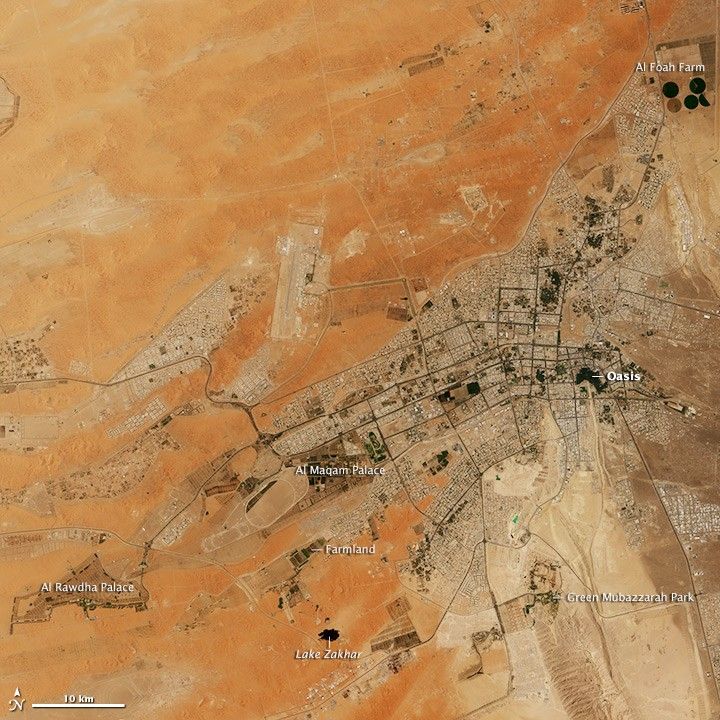 In 1984, green areas were mostly limited to the large oasis in the historic center of the city. By 2015, several new parks, farms, nature preserves, and palace gardens had emerged, particularly to the south and west of the city. As noted in one recent study, the city now contains 12 million square meters of green space—an average of 32 square meters (344 square feet) per resident, more than any other city in the Arab world. The population has expanded rapidly as well, rising from about 50,000 people in 1975 to more than 630,000 in 2012. The expansion of urban areas—gray in the images—has primarily proceeded westward from the city center due to an abundance of open space and the presence of transportation, water, and power infrastructure.